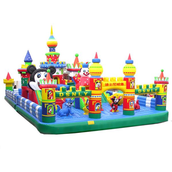 This is a giant bouncy mattress for a bunch of kids to jump and romp around together. Kids will be cheerful to see so many playful elements, such as the crawling tunnel, several small slides, a higher platform to climb on, and don’t forget the mickey mouse pop ups and the giant blow up Chinese dragon and octopus.